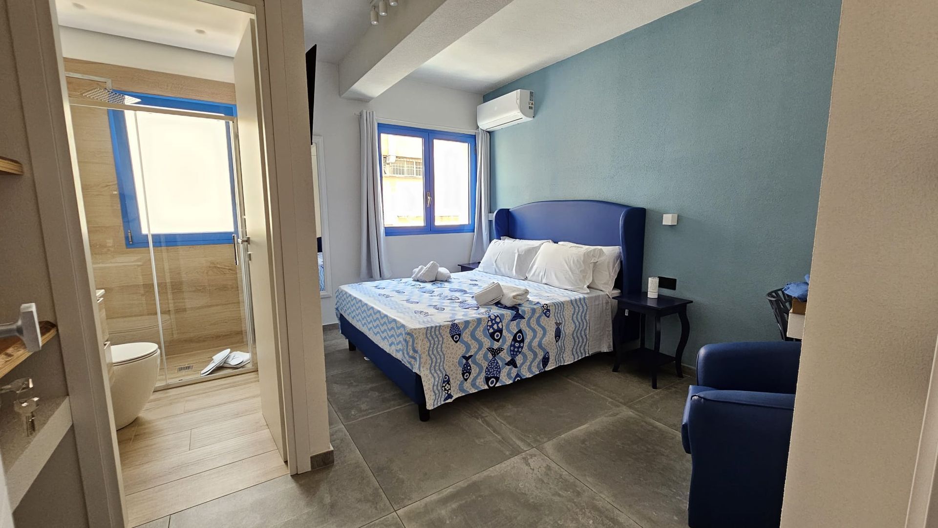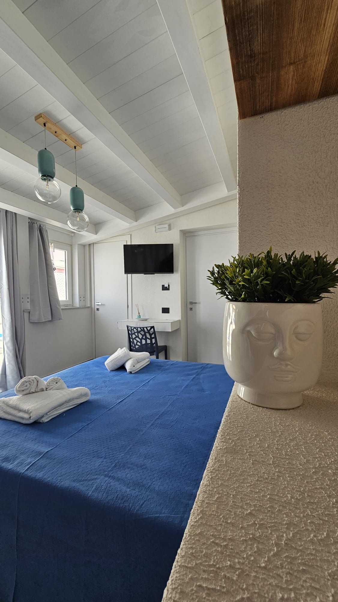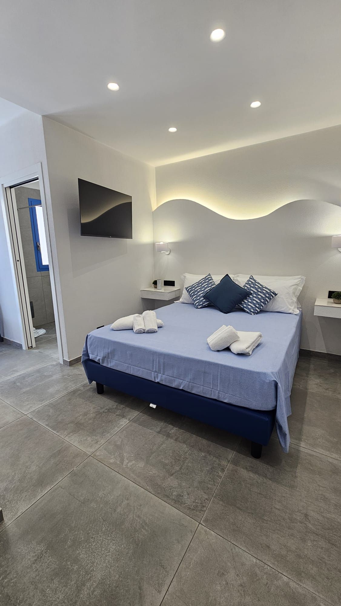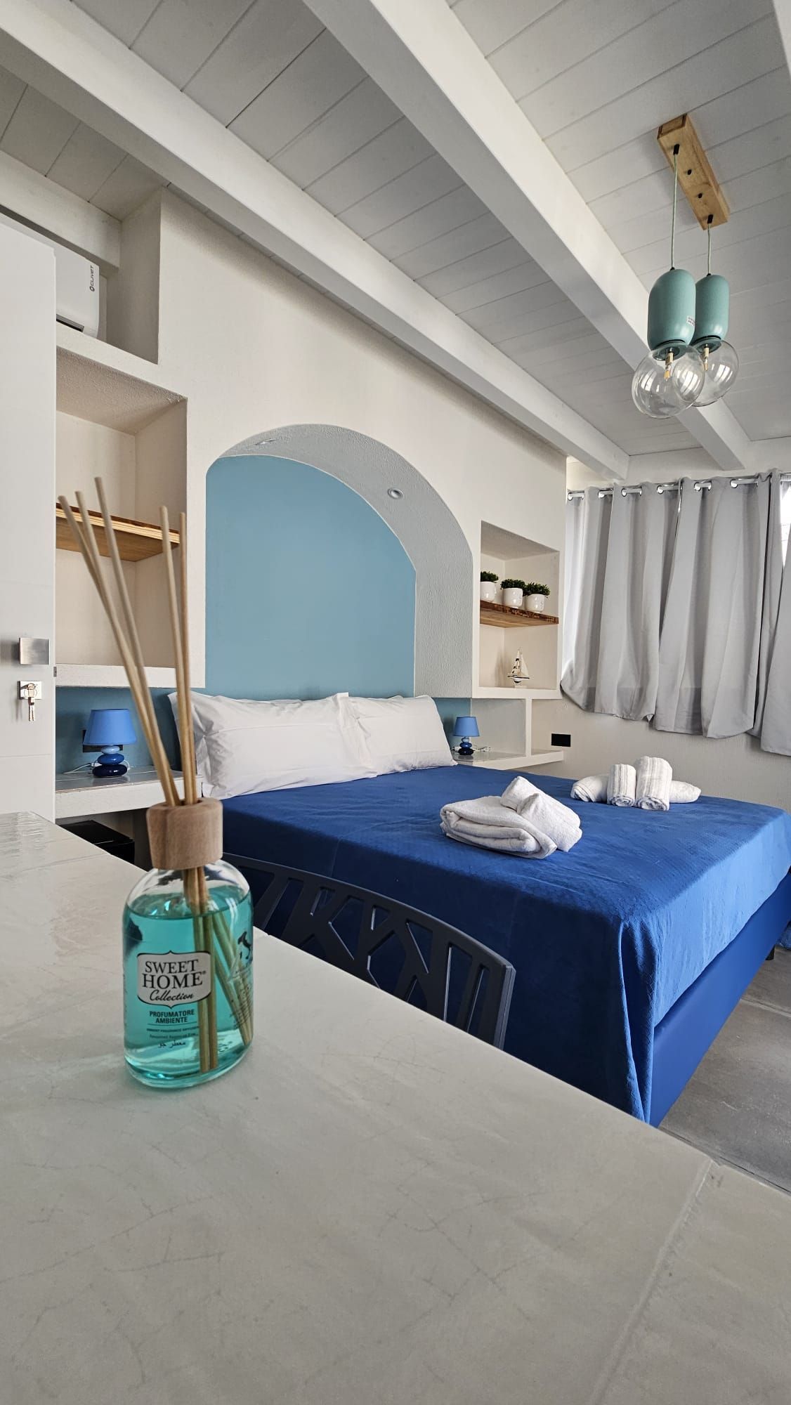 La nostra guest house, avvolta nei toni rilassanti dell'azzurro e del bianco che evocano le magiche atmosfere di Santorini, offre non solo un soggiorno lussuoso ma anche un vero e proprio angolo di paradiso: la nostra caratteristica piscina arricchita da una incantevole cascata in miniatura.
