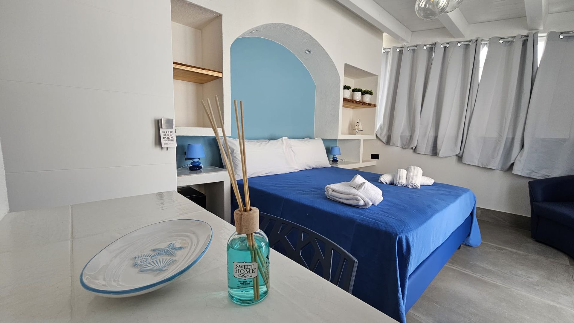 La nostra guest house, avvolta nei toni rilassanti dell'azzurro e del bianco che evocano le magiche atmosfere di Santorini, offre non solo un soggiorno lussuoso ma anche un vero e proprio angolo di paradiso: la nostra caratteristica piscina arricchita da una incantevole cascata in miniatura.